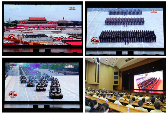 閱兵式開(kāi)始后,現(xiàn)場(chǎng)時(shí)而寂靜無(wú)聲,時(shí)而爆發(fā)出雷鳴般的掌聲。直升機(jī)梯隊(duì)護(hù)衛(wèi)著黨旗、國(guó)旗、軍旗飛過(guò)天安門(mén)上空時(shí),人群中發(fā)出陣陣驚嘆;當(dāng)威武帥氣、整齊劃一的方隊(duì)邁著鏗鏘步伐通過(guò)檢閱臺(tái)時(shí),員工們不由自主地挺直腰板;當(dāng)新型主戰(zhàn)坦克、隱形戰(zhàn)機(jī)、高超聲速導(dǎo)彈、核導(dǎo)彈等“大國(guó)重器”出現(xiàn)時(shí),大家紛紛舉起手機(jī)記錄這激動(dòng)人心的時(shí)刻。整個(gè)閱兵環(huán)節(jié),禮堂內(nèi)驚嘆聲、掌聲此起彼伏,員工們的民族自豪感、發(fā)展成就感、奮斗責(zé)任感油然而生。